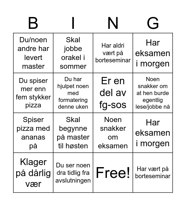 This bingo card has 26 words: Du/noen andre drikker kun cola zero, Du skal på vors etterpå, Noen snakker om at hen burde egentlig lese/jobbe nå, Har eksamensvakt i morgen, Du spiser mer enn fem stykker pizza, Du/noen andre har levert master, Du har hjulpet noen med formatering denne uken, Skal jobbe orakel i sommer, Free!, Har annen sommerjobb enn orakel, Spiser pizza med ananas på, Noen snakker om eksamen, "Norwegian arm"-er for å få tak i pizza, Du gir klem til noen som skal slutte i orakel, Har eksamen i morgen, Skal drikke øl etterpå, Har eksamen i morgen, Har vært på borteseminar, Har aldri vært på borteseminar, Klager på dårlig vær, Skal begynne på master til høsten, Blir rørt av talen til Ari/Torjus, Du ser noen dra tidlig fra avslutningen, Har eksamen i morgen, Er en del av fg-sos and Erklær din kjærlighet til et orakel.