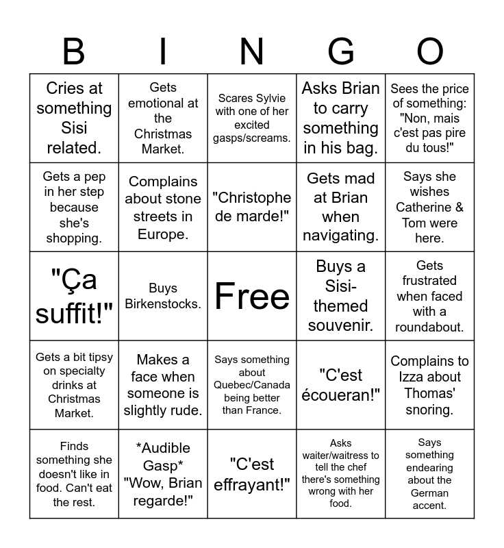 This bingo card has a free space and 26 words: Says something about Quebec/Canada being better than France., Asks waiter/waitress to tell the chef there's something wrong with her food., "Christophe de marde!", *Audible Gasp* "Wow, Brian regarde!", Sees the price of something: "Non, mais c'est pas pire du tous!", Cries at something Sisi related., Gets a pep in her step because she's shopping., Gets emotional at the Christmas Market., Gets frustrated when faced with a roundabout., "C'est écoueran!", Gets mad at Brian when navigating., "Ça suffit!", Complains to Izza about Thomas' snoring., Finds something she doesn't like in food. Can't eat the rest., Buys Birkenstocks., Complains about the the French., Asks Brian to carry something in his bag., Gets a bit tipsy on specialty drinks at Christmas Market., Scares Sylvie with one of her excited gasps/screams., Says something endearing about the German accent., Says she wishes Catherine & Tom were here., "C'est effrayant!", Buys a Sisi-themed souvenir., Makes a face when someone is slightly rude., Complains about stone streets in Europe. and Complains about sidewalks/streets being too narrow..