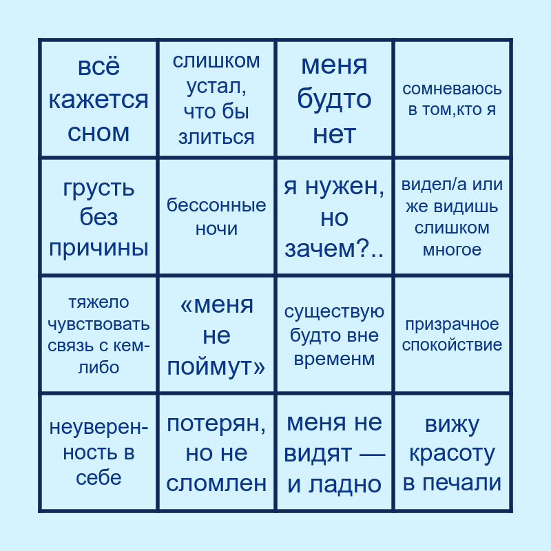 This bingo card has 16 words: потерян, но не сломлен, призрачное спокойствие, меня будто нет, всё кажется сном, тяжело чувствовать связь с кем-либо, слишком устал, что бы злиться, существую будто вне временм, меня не видят — и ладно, грусть без причины, бессонные ночи, неуверен-ность в себе, сомневаюсь в том,кто я, «меня не поймут», видел/а или же видишь слишком многое, я нужен, но зачем?.. and вижу красоту в печали.