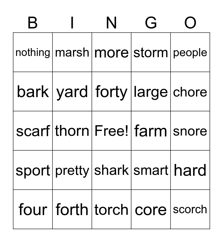 This bingo card has a free space and 24 words: pretty, forth, forty, four, people, nothing, bark, marsh, farm, shark, large, scarf, smart, hard, yard, core, snore, more, chore, thorn, scorch, sport, storm and torch.