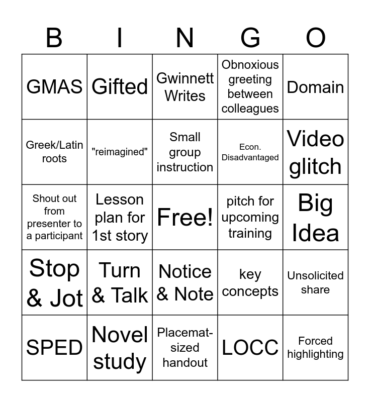 This bingo card has a free space and 31 words: Placemat-sized handout, 3+ colors on a page, Lesson plan for 1st story, "exemplar", GMAS, Gwinnett Writes, "reimagined", key concepts, pitch for upcoming training, LOCC, Big Idea, Forced highlighting, Tabbing pages, Forced annotation, Video glitch, Phone rings, Unsolicited share, Turn & Talk, Stop & Jot, Notice & Note, Domain, ML, SPED, Gifted, Econ. Disadvantaged, Greek/Latin roots, Obnoxious greeting between colleagues, Shout out from presenter to a participant, Novel study, Small group instruction and Inconvenient charging cable.
