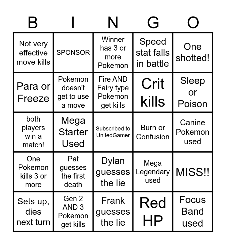 This bingo card has a free space and 24 words: Pat guesses the first death, Gen 2 AND 3 Pokemon get kills, Fire AND Fairy type Pokemon get kills, Sets up, dies next turn, One shotted!, Not very effective move kills, Para or Freeze, SPONSOR, Burn or Confusion, Dylan guesses the lie, Crit kills, both players win a match!, Mega Legendary used, MISS!!, Pokemon doesn't get to use a move, Red HP, Canine Pokemon used, Winner has 3 or more Pokemon, Sleep or Poison, Mega Starter Used, Focus Band used, One Pokemon kills 3 or more, Speed stat falls in battle and Frank guesses the lie.