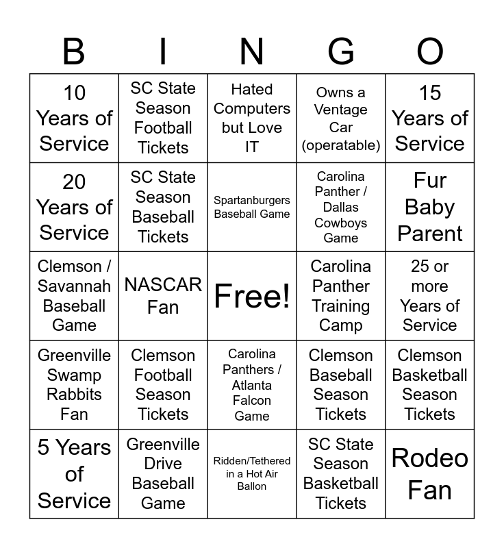 This bingo card has a free space and 24 words: Clemson Football Season Tickets, Greenville Drive Baseball Game, Spartanburgers Baseball Game, 5 Years of Service, 15 Years of Service, 10 Years of Service, 20 Years of Service, SC State Season Football Tickets, Carolina Panther Training Camp, Carolina Panthers / Atlanta Falcon Game, Carolina Panther / Dallas Cowboys Game, Clemson / Savannah Baseball Game, Clemson Baseball Season Tickets, Clemson Basketball Season Tickets, SC State Season Baseball Tickets, SC State Season Basketball Tickets, 25 or more Years of Service, Hated Computers but Love IT, Fur Baby Parent, NASCAR Fan, Rodeo Fan, Greenville Swamp Rabbits Fan, Owns a Ventage Car (operatable) and Ridden/Tethered in a Hot Air Ballon.