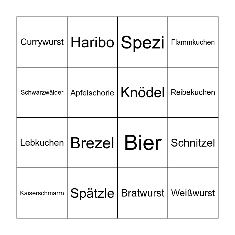 This bingo card has 27 words: Free!, Berliner, Lebkuchen, Gulasch, Apfelschorle, Spezi, Haribo, Weißwurst, Spätzle, Frikadelle, Bier, Flammkuchen, Sachertorte, Schweinshaxe, Brezel, Brötchen, Knödel, Reibekuchen, Kartoffelsalat, Currywurst, Bratwurst, Sauerkraut, Schnitzel, Kaiserschmarrn, Apfelstrudel, Schwarzwälder and Kirschtorte.