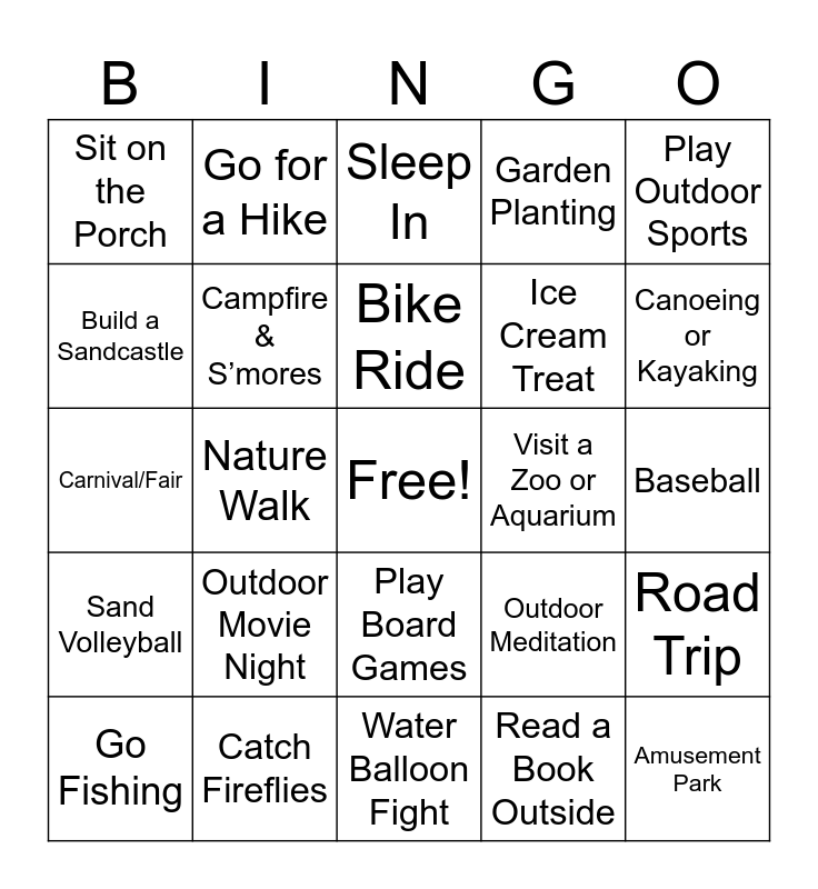 This bingo card has a free space and 51 words: Beach Day, Amusement Park, Picnic, Water Balloon Fight, Outdoor Movie Night, Visit a Farmers’ Market, Go for a Hike, BBQ, Build a Sandcastle, Go Swimming, Campfire & S’mores, Garden Planting, Road Trip, Outdoor Meditation, Outdoor Concert, Pickleball, Bike Ride, Visit a Zoo or Aquarium, Stargazing, Play Outdoor Sports, Nature Walk, Read a Book Outside, Sit on the Porch, Ice Cream Treat, Slip ‘n Slide, Photography Walk, Canoeing or Kayaking, Horseback Riding, Go Fishing, Sleep In, Hang out with Family and Friends, Crafts, Watch Fireworks, Lemonade Stand, Sidewalk Chalk Art, Catch Fireflies, Watch a Sunset, Watch a Sunrise, Miniature Golf, Backyard Games, Baseball, Sand Volleyball, Tennis, Ride Quads, Video Games, Parades, Carnival/Fair, Go to the Park, Bake Cookies, Play Board Games and Pony World Series.
