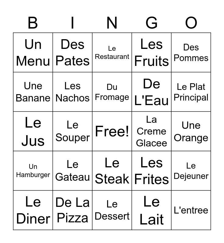 This bingo card has a free space and 26 words: Le Steak, Le Lait, Du Fromage, De La Pizza, Des Pommes, Un Menu, Une Banane, Des Pates, Une Orange, Les Frites, De L'Eau, Le Jus, Le Dejeuner, Le Diner, Le Souper, L'Anana, Les Fruits, Un Hamburger, Le Restaurant, L'entree, Le Plat Principal, Le Dessert, La Creme Glacee, Le Gateau, Les Nachos and Les Sushis.
