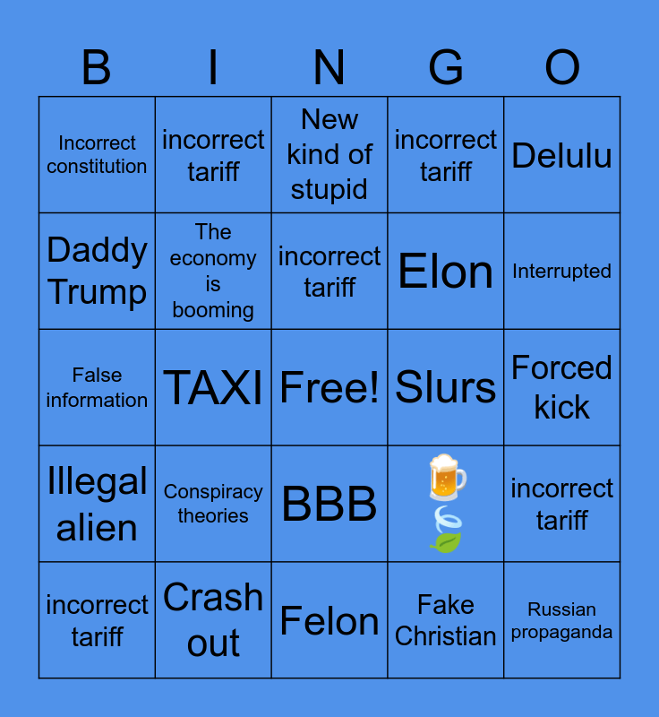 This bingo card has a free space and 29 words: incorrect tariff, internalized Racism, TAXI, Follow the money, Incorrect constitution, New kind of stupid, The economy is booming, Conspiracy theories, Slurs, Crash out, Forced kick, Russian propaganda, Felon, Fake Christian, Interrupted, Pull up, BBB, Illegal alien, Delulu, False information, 🍺🍃, Monologue on off topic subjects, Elon, Daddy Trump, incorrect tariff, incorrect tariff, incorrect tariff, incorrect tariff and incorrect tariff.