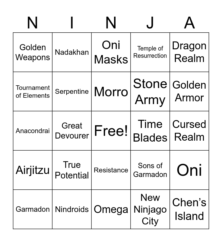 This bingo card has a free space and 24 words: True Potential, Nindroids, Morro, Garmadon, Dragon Realm, Golden Weapons, Tournament of Elements, Nadakhan, Time Blades, Resistance, Stone Army, Anacondrai, Sons of Garmadon, Oni, Serpentine, New Ninjago City, Cursed Realm, Oni Masks, Golden Armor, Great Devourer, Chen’s Island, Airjitzu, Temple of Resurrection and Omega.