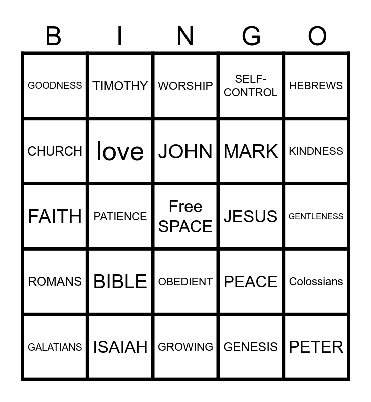 This bingo card has a free space and 24 words: BIBLE, ISAIAH, JOHN, GALATIANS, HEBREWS, GOODNESS, CHURCH, TIMOTHY, JESUS, OBEDIENT, MARK, FAITH, PEACE, Colossians, love, GENESIS, GENTLENESS, WORSHIP, KINDNESS, PATIENCE, PETER, ROMANS, SELF-CONTROL and GROWING.