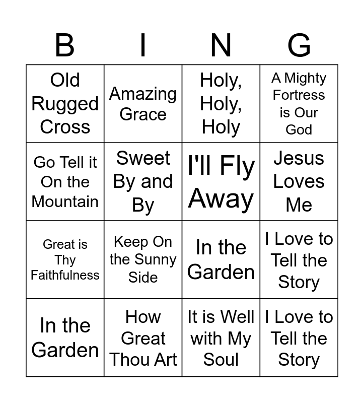 This bingo card has 21 words: How Great Thou Art, He's Got the Whole World, Amazing Grace, Blessed Assurance, It is Well with My Soul, I'll Fly Away, Old Rugged Cross, Holy, Holy, Holy, In the Garden, Jesus Loves Me, Great is Thy Faithfulness, A Mighty Fortress is Our God, I Love to Tell the Story, What a Friend we have in Jesus, Sweet By and By, O How I love Jesus, In the Garden, Keep On the Sunny Side, Go Tell it On the Mountain, I Love to Tell the Story and Little Light of Mine.