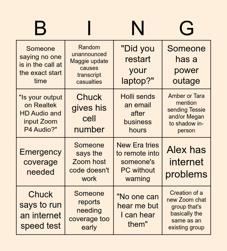This bingo card has 16 words: Someone reports needing coverage too early, Alex has internet problems, "Did you restart your laptop?", Someone saying no one is in the call at the exact start time, Emergency coverage needed, Random unannounced Maggie update causes transcript casualties, New Era tries to remote into someone's PC without warning, "No one can hear me but I can hear them", "Is your output on Realtek HD Audio and input Zoom P4 Audio?", Chuck gives his cell number, Chuck says to run an internet speed test, Someone has a power outage, Someone says the Zoom host code doesn't work, Amber or Tara mention sending Tessie and/or Megan to shadow in-person, Holli sends an email after business hours and Creation of a new Zoom chat group that's basically the same as an existing group.