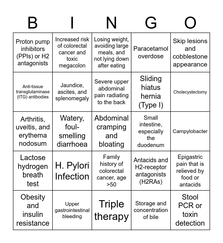 This bingo card has 25 words: H. Pylori Infection, Triple therapy, Severe upper abdominal pain radiating to the back, Obesity and insulin resistance, Skip lesions and cobblestone appearance, Proton pump inhibitors (PPIs) or H2 antagonists, Anti-tissue transglutaminase (tTG) antibodies, Increased risk of colorectal cancer and toxic megacolon, Small intestine, especially the duodenum, Family history of colorectal cancer, age >50, Sliding hiatus hernia (Type I), Arthritis, uveitis, and erythema nodosum, Antacids and H2-receptor antagonists (H2RAs), Epigastric pain that is relieved by food or antacids, Jaundice, ascites, and splenomegaly, Stool PCR or toxin detection, Campylobacter, Losing weight, avoiding large meals, and not lying down after eating, Cholecystectomy, Watery, foul-smelling diarrhoea, Abdominal cramping and bloating, Upper gastrointestinal bleeding, Lactose hydrogen breath test, Paracetamol overdose and Storage and concentration of bile.