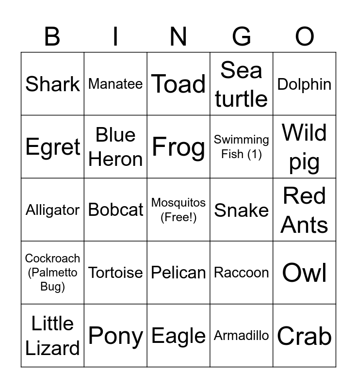 This bingo card has a free space and 24 words: Tortoise, Pony, Frog, Little Lizard, Dolphin, Shark, Egret, Manatee, Snake, Pelican, Swimming Fish (1), Alligator, Raccoon, Owl, Blue Heron, Armadillo, Red Ants, Toad, Wild pig, Bobcat, Crab, Cockroach (Palmetto Bug), Sea turtle and Eagle.