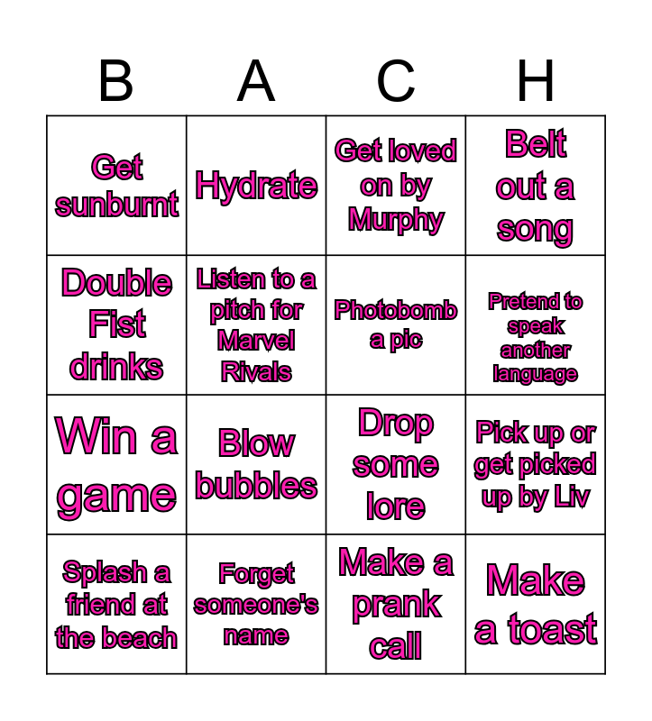 This bingo card has 20 words: Pick up or get picked up by Liv, Get Liv to say "sorry" with her accent, Get loved on by Murphy, Share your favorite Liv and Jake memory, Splash a friend at the beach, Double Fist drinks, Forget someone's name, Get sunburnt, Win a game, Hydrate, Blow bubbles, Drop some lore, Listen to a pitch for Marvel Rivals, Make a toast, Photobomb a pic, Do something weird with the blow up banana, Pretend to speak another language, Belt out a song, Make a prank call and Cry.