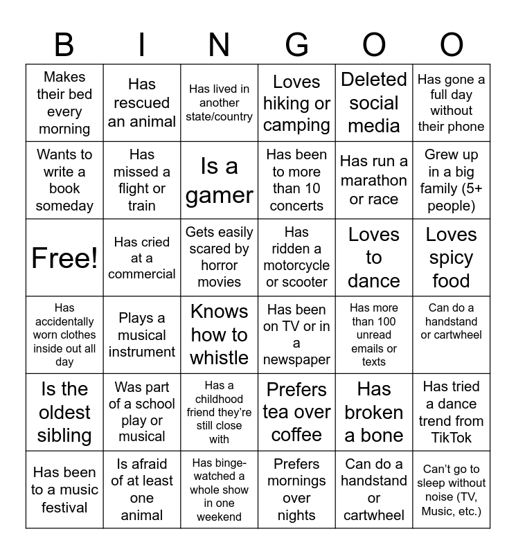 This bingo card has 36 words: Prefers tea over coffee, Has a childhood friend they’re still close with, Prefers mornings over nights, Wants to write a book someday, Has accidentally worn clothes inside out all day, Has ridden a motorcycle or scooter, Has missed a flight or train, Has binge-watched a whole show in one weekend, Deleted social media, Has broken a bone, Grew up in a big family (5+ people), Loves hiking or camping, Has tried a dance trend from TikTok, Has cried at a commercial, Has been to more than 10 concerts, Makes their bed every morning, Is the oldest sibling, Loves to dance, Free!, Has lived in another state/country, Gets easily scared by horror movies, Plays a musical instrument, Has been on TV or in a newspaper, Knows how to whistle, Has more than 100 unread emails or texts, Has rescued an animal, Has run a marathon or race, Is afraid of at least one animal, Is a gamer, Has gone a full day without their phone, Can’t go to sleep without noise (TV, Music, etc.), Has been to a music festival, Can do a handstand or cartwheel, Loves spicy food, Was part of a school play or musical and Can do a handstand or cartwheel.