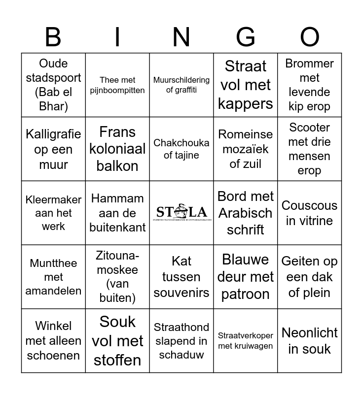 This bingo card has a free space and 24 words: Zitouna-moskee (van buiten), Souk vol met stoffen, Chakchouka of tajine, Winkel met alleen schoenen, Brommer met levende kip erop, Oude stadspoort (Bab el Bhar), Kalligrafie op een muur, Thee met pijnboompitten, Bord met Arabisch schrift, Kat tussen souvenirs, Romeinse mozaïek of zuil, Kleermaker aan het werk, Blauwe deur met patroon, Geiten op een dak of plein, Frans koloniaal balkon, Straatverkoper met kruiwagen, Couscous in vitrine, Muurschildering of graffiti, Scooter met drie mensen erop, Hammam aan de buitenkant, Neonlicht in souk, Muntthee met amandelen, Straat vol met kappers and Straathond slapend in schaduw.