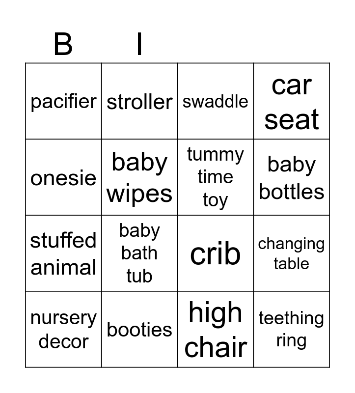 This bingo card has 26 words: Free!, diapers, baby bottles, baby blanket, onesie, pacifier, baby wipes, stroller, high chair, baby socks, stuffed animal, crib, baby shampoo, baby lotion, changing table, baby monitor, car seat, teething ring, swaddle, nursery decor, baby bath tub, baby book, booties, hat, tummy time toy and bath robe.