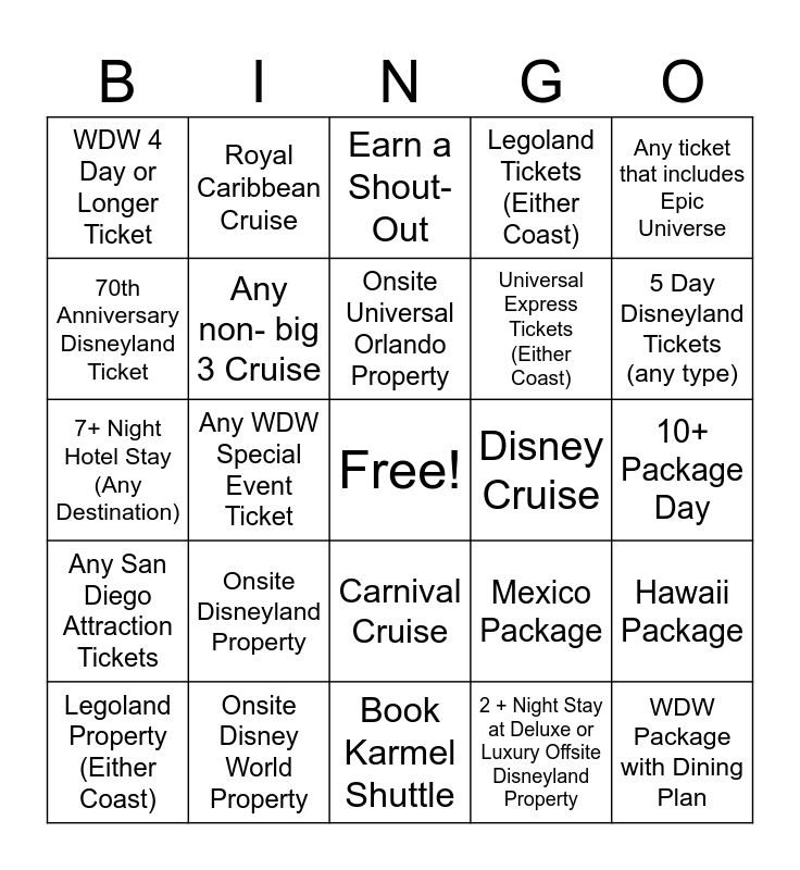 This bingo card has a free space and 24 words: Onsite Disneyland Property, Onsite Disney World Property, Onsite Universal Orlando Property, Legoland Property (Either Coast), Any ticket that includes Epic Universe, WDW 4 Day or Longer Ticket, 70th Anniversary Disneyland Ticket, Royal Caribbean Cruise, Disney Cruise, Carnival Cruise, Universal Express Tickets (Either Coast), 7+ Night Hotel Stay (Any Destination), Mexico Package, Hawaii Package, Any non- big 3 Cruise, 2 + Night Stay at Deluxe or Luxury Offsite Disneyland Property, 10+ Package Day, Earn a Shout-Out, 5 Day Disneyland Tickets (any type), Any WDW Special Event Ticket, WDW Package with Dining Plan, Any San Diego Attraction Tickets, Legoland Tickets (Either Coast) and Book Karmel Shuttle.