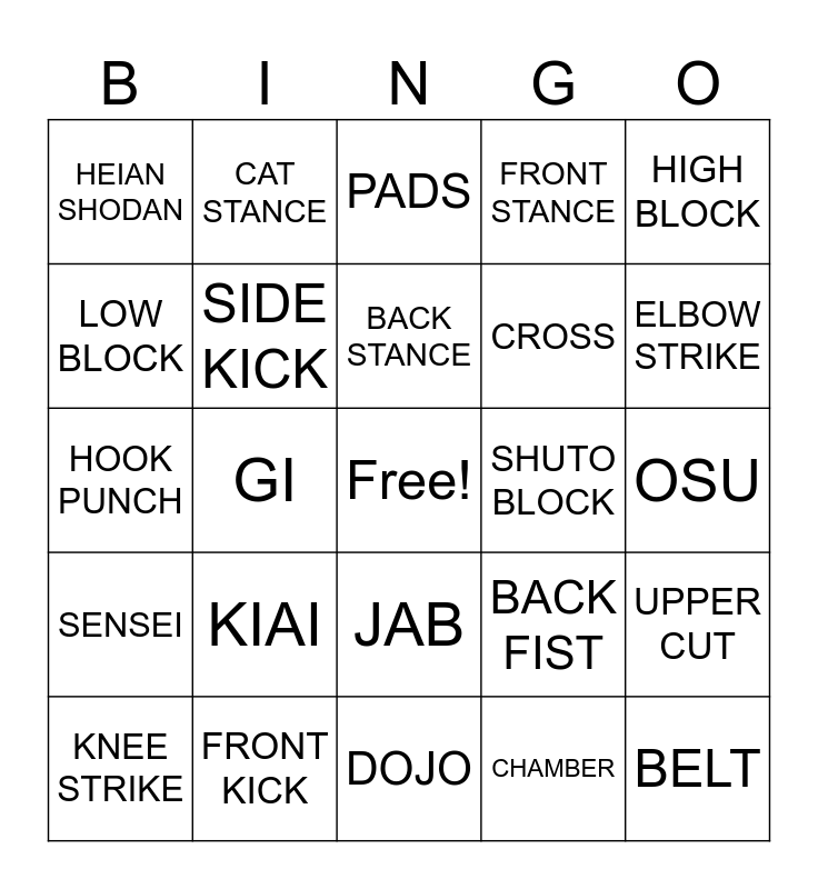 This bingo card has a free space and 24 words: KIAI, FRONT KICK, BACK STANCE, KNEE STRIKE, HIGH BLOCK, HEIAN SHODAN, LOW BLOCK, CAT STANCE, SHUTO BLOCK, JAB, CROSS, HOOK PUNCH, BACK FIST, UPPER CUT, SIDE KICK, CHAMBER, OSU, PADS, ELBOW STRIKE, GI, BELT, SENSEI, FRONT STANCE and DOJO.