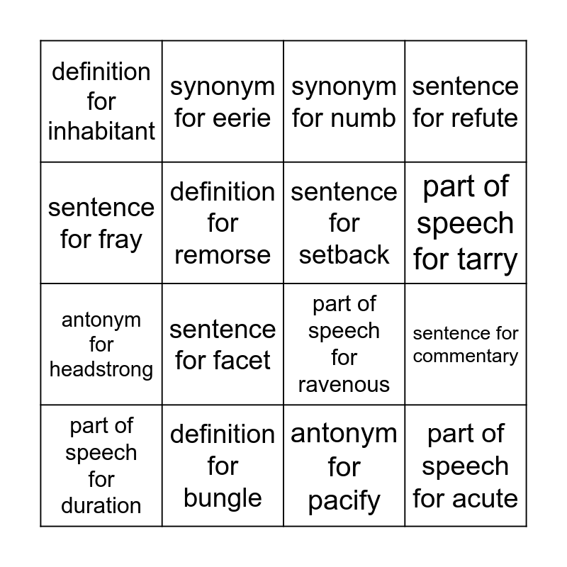This bingo card has 16 words: definition for bungle, sentence for commentary, synonym for numb, definition for inhabitant, antonym for headstrong, synonym for eerie, part of speech for ravenous, antonym for pacify, sentence for fray, definition for remorse, part of speech for duration, sentence for refute, sentence for facet, part of speech for tarry, sentence for setback and part of speech for acute.