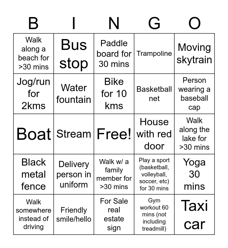 This bingo card has a free space and 24 words: Delivery person in uniform, Friendly smile/hello, Bike for 10 kms, Walk somewhere instead of driving, Moving skytrain, Walk along a beach for >30 mins, Jog/run for 2kms, Bus stop, House with red door, Walk w/ a family member for >30 mins, Basketball net, Boat, Play a sport (basketball, volleyball, soccer, etc) for 30 mins, Yoga 30 mins, Water fountain, Gym workout 60 mins (not including treadmill), Walk along the lake for >30 mins, Paddle board for 30 mins, Person wearing a baseball cap, Stream, Taxi car, Black metal fence, Trampoline and For Sale real estate sign.
