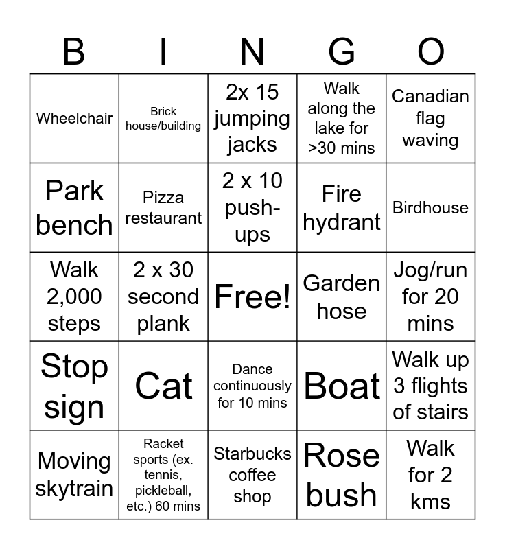 This bingo card has a free space and 24 words: Cat, Racket sports (ex. tennis, pickleball, etc.) 60 mins, 2 x 10 push-ups, Moving skytrain, Canadian flag waving, Wheelchair, Park bench, Brick house/building, Garden hose, Dance continuously for 10 mins, Fire hydrant, Walk 2,000 steps, Boat, Walk up 3 flights of stairs, Pizza restaurant, Rose bush, Jog/run for 20 mins, 2x 15 jumping jacks, Birdhouse, 2 x 30 second plank, Walk for 2 kms, Stop sign, Walk along the lake for >30 mins and Starbucks coffee shop.