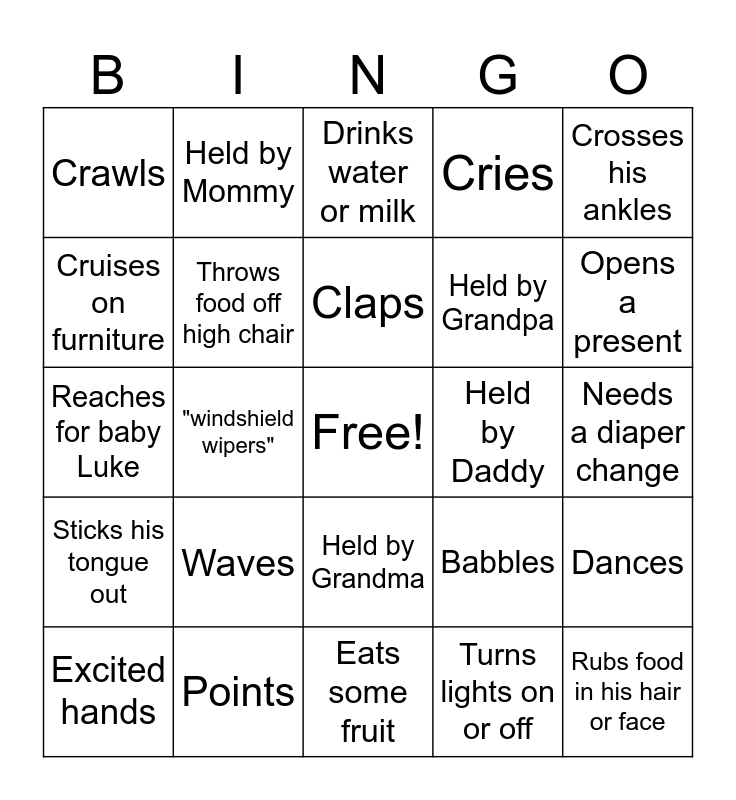 This bingo card has a free space and 24 words: Waves, Points, Claps, Excited hands, Crosses his ankles, Crawls, Cruises on furniture, Held by Mommy, Held by Daddy, Held by Grandma, Held by Grandpa, Reaches for baby Luke, Babbles, Dances, Throws food off high chair, Turns lights on or off, Needs a diaper change, Drinks water or milk, Opens a present, "windshield wipers", Rubs food in his hair or face, Sticks his tongue out, Cries and Eats some fruit.