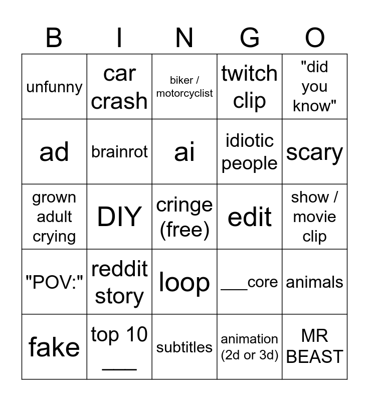 This bingo card has a free space and 39 words: food, less than 10 likes, more than 1 million likes, brainrot, fake, loop, ai, trick shot, "did you know", "POV:", DIY, twitch clip, MR BEAST, show / movie clip, edit, reddit story, actually funny / good, unfunny, crime happens, ___core, ad, subtitles, idiotic people, scary, minecraft, roblox, fortnite, family guy, longer than a minute, car crash, karen, like beggar in comments, biker / motorcyclist, top 10 ___, animation (2d or 3d), language that isnt english, animals, grown adult crying and sports.