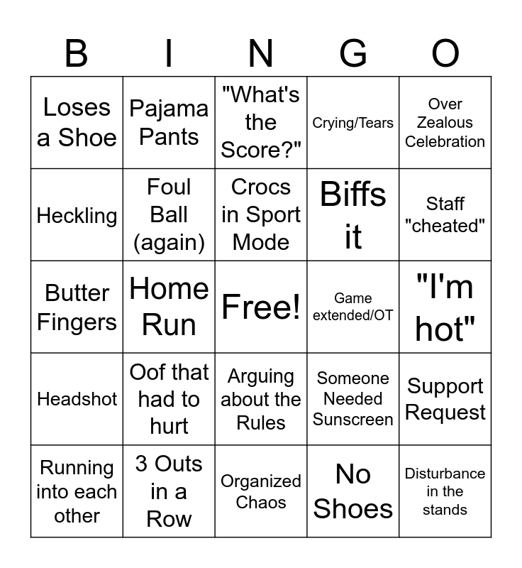 This bingo card has a free space and 26 words: Arguing about the Rules, No Shoes, Crocs in Sport Mode, 3 Outs in a Row, Over Zealous Celebration, Loses a Shoe, Heckling, Pajama Pants, "I'm hot", Someone Needed Sunscreen, Biffs it, Butter Fingers, Support Request, Running into each other, Home Run, Forced Cheering, Crying/Tears, Headshot, "What's the Score?", Disturbance in the stands, Staff "cheated", Organized Chaos, Game extended/OT, Oof that had to hurt, Foul Ball (again) and Those socks are ruined.
