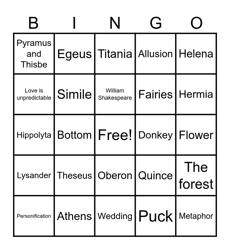 This bingo card has a free space and 24 words: Theseus, Athens, William Shakespeare, Personification, Helena, Pyramus and Thisbe, Love is unpredictable, Egeus, Donkey, Oberon, Fairies, Hippolyta, Quince, The forest, Simile, Puck, Flower, Titania, Hermia, Bottom, Metaphor, Lysander, Allusion and Wedding.