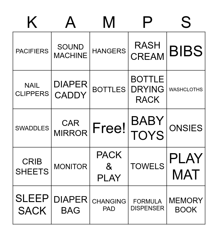 This bingo card has a free space and 24 words: MONITOR, DIAPER BAG, BOTTLES, SLEEP SACK, BIBS, PACIFIERS, NAIL CLIPPERS, SOUND MACHINE, BABY TOYS, PACK & PLAY, BOTTLE DRYING RACK, SWADDLES, TOWELS, PLAY MAT, DIAPER CADDY, FORMULA DISPENSER, ONSIES, HANGERS, WASHCLOTHS, CAR MIRROR, MEMORY BOOK, CRIB SHEETS, RASH CREAM and CHANGING PAD.