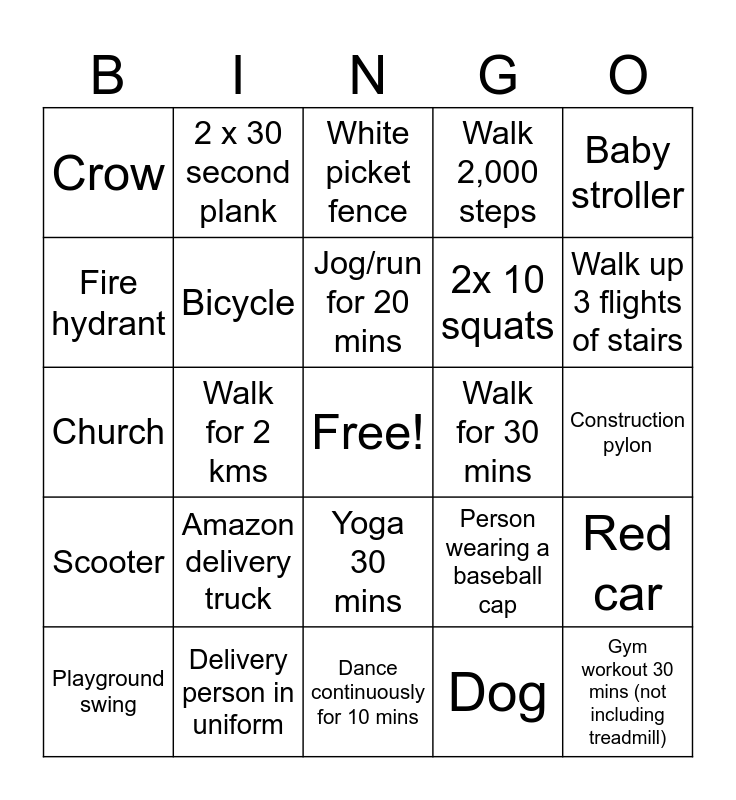 This bingo card has a free space and 24 words: Amazon delivery truck, Delivery person in uniform, Jog/run for 20 mins, Playground swing, Baby stroller, Crow, Fire hydrant, 2 x 30 second plank, Walk for 30 mins, Yoga 30 mins, 2x 10 squats, Church, Person wearing a baseball cap, Red car, Bicycle, Dog, Construction pylon, White picket fence, Walk up 3 flights of stairs, Walk for 2 kms, Gym workout 30 mins (not including treadmill), Scooter, Walk 2,000 steps and Dance continuously for 10 mins.