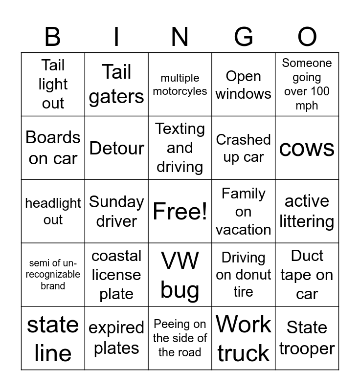 This bingo card has a free space and 49 words: Speeding sports car, State trooper, boat trailer, Peeing on the side of the road, coastal license plate, Cars racing, Tail gaters, Someone pulled over, Boards on car, Road work, Detour, Open windows, Duct tape on car, Driving on donut tire, Temporary license plate, Amazon truck/ warehouse, Texting and driving, Family on vacation, Spanish sign, Someone going over 100 mph, Sunday driver, Work truck, Tail light out, Crashed up car, horse, cows, state line, state park, VW bug, semi of un-recognizable brand, sports team sticker, religious vanity plate, non-local chain, unsafe motorcylcing, expired plates, too-tinted windows, no license plate, smoking out the window, active littering, VW Van, Classic restored car, corvette, Veterans sticker, patriotic sticker, headlight out, multiple motorcyles, dog passenger, multiple dog passengers and non-dog animal passenger.