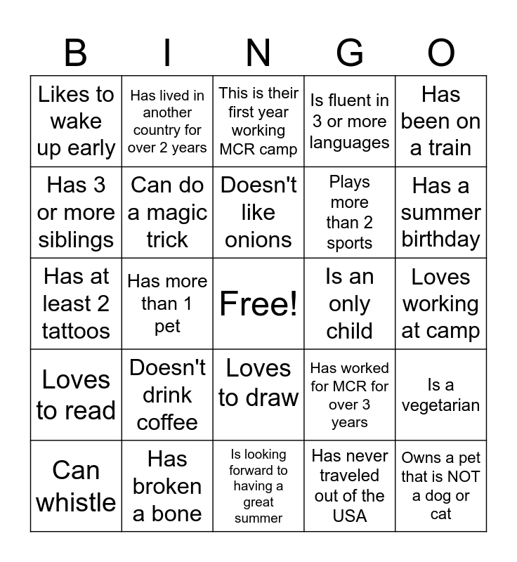 This bingo card has a free space and 24 words: Doesn't drink coffee, Has broken a bone, Doesn't like onions, Can whistle, Has been on a train, Likes to wake up early, Has 3 or more siblings, Has lived in another country for over 2 years, Is an only child, Loves to draw, Plays more than 2 sports, Has at least 2 tattoos, Has worked for MCR for over 3 years, Is a vegetarian, Can do a magic trick, Has never traveled out of the USA, Loves working at camp, This is their first year working MCR camp, Has a summer birthday, Has more than 1 pet, Owns a pet that is NOT a dog or cat, Loves to read, Is fluent in 3 or more languages and Is looking forward to having a great summer.