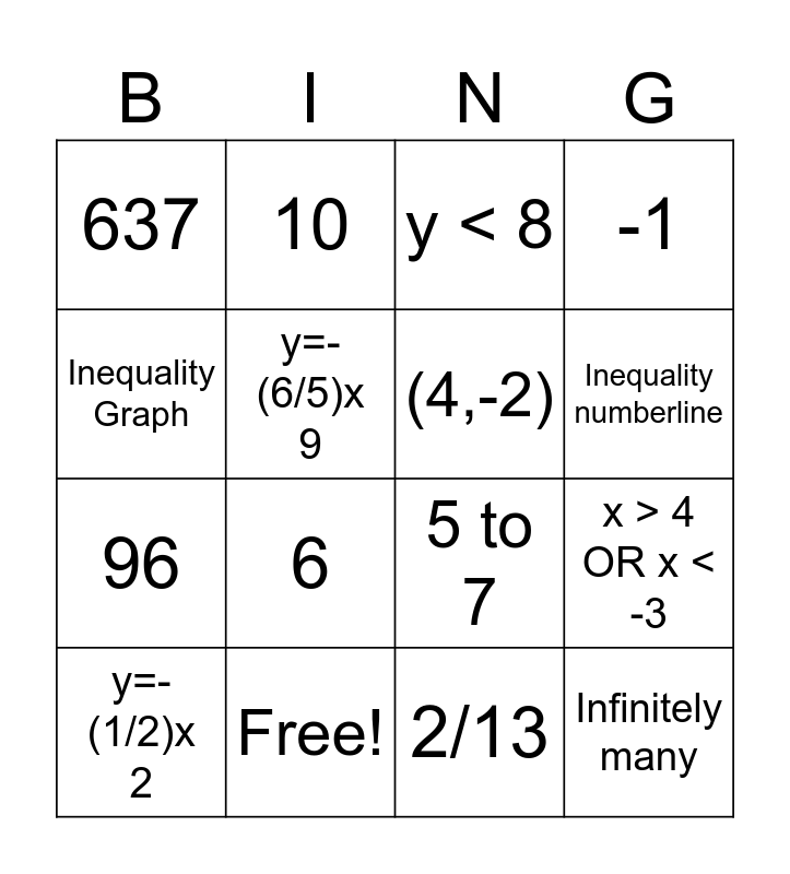 This bingo card has 16 words: Free!, x > 4 OR x < -3, y < 8, 637, 96, 10, 5 to 7, 2/13, Inequality Graph, y=-(6/5)x 9, y=-(1/2)x 2, -1, 6, Inequality numberline, (4,-2) and Infinitely many.