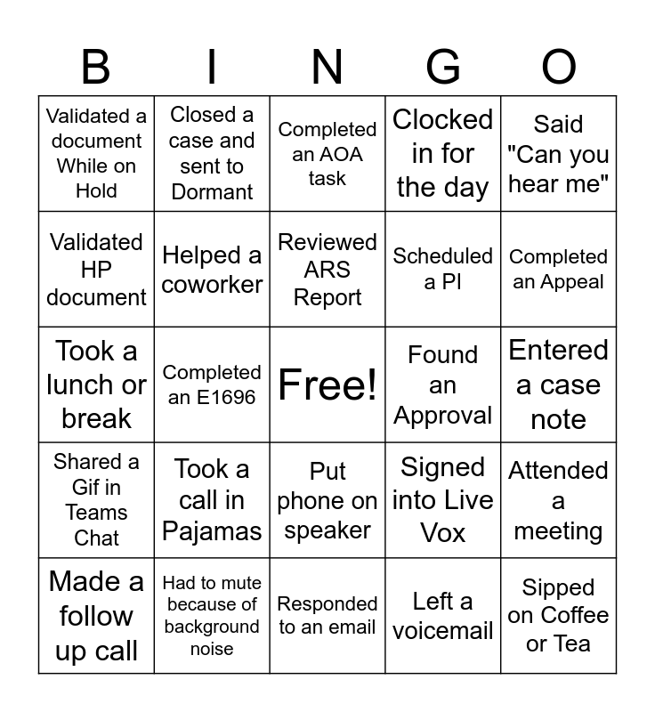 This bingo card has a free space and 24 words: Took a call in Pajamas, Had to mute because of background noise, Reviewed ARS Report, Made a follow up call, Said "Can you hear me", Validated a document While on Hold, Validated HP document, Closed a case and sent to Dormant, Found an Approval, Put phone on speaker, Scheduled a PI, Took a lunch or break, Signed into Live Vox, Attended a meeting, Helped a coworker, Left a voicemail, Entered a case note, Completed an AOA task, Completed an Appeal, Completed an E1696, Sipped on Coffee or Tea, Shared a Gif in Teams Chat, Clocked in for the day and Responded to an email.