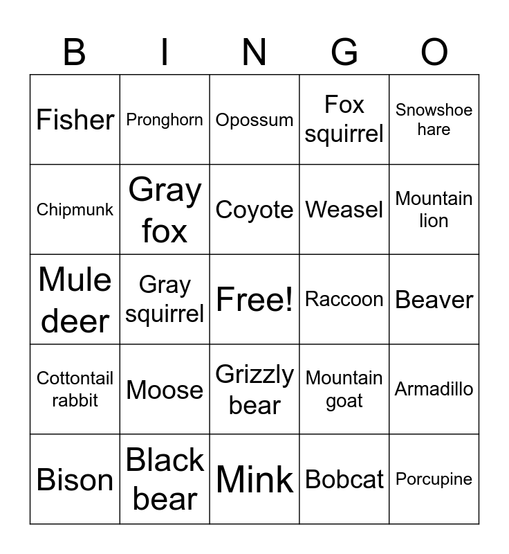 This bingo card has a free space and 41 words: White-tailed deer, Mule deer, Red fox, Gray fox, Black bear, Grizzly bear, Coyote, Gray wolf, Snowshoe hare, Cottontail rabbit, Gray squirrel, Fox squirrel, Porcupine, Beaver, Raccoon, Moose, Otter, Fisher, Marten, Opossum, Armadillo, Groundhog, Mink, Weasel, Badger, Big brown bat, Bobcat, Lynx, Mountain lion, Striped skunk, Elk, Pronghorn, Bison, Bighorn sheep, Mountain goat, Chipmunk, Wood rat, Red squirrel, Deer mouse, Caribou and Wolverine.