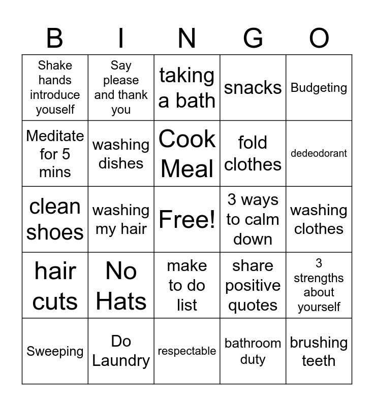 This bingo card has a free space and 24 words: No Hats, Do Laundry, Cook Meal, Sweeping, Budgeting, Shake hands introduce youself, Meditate for 5 mins, Say please and thank you, 3 ways to calm down, make to do list, fold clothes, clean shoes, share positive quotes, 3 strengths about yourself, washing dishes, bathroom duty, washing clothes, taking a bath, dedeodorant, washing my hair, brushing teeth, hair cuts, snacks and respectable.
