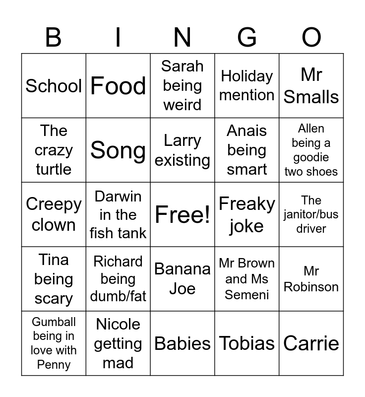 This bingo card has a free space and 24 words: Richard being dumb/fat, Nicole getting mad, Larry existing, Gumball being in love with Penny, Mr Smalls, School, The crazy turtle, Food, Freaky joke, Banana Joe, Anais being smart, Creepy clown, Mr Brown and Ms Semeni, Mr Robinson, Song, Tobias, The janitor/bus driver, Sarah being weird, Allen being a goodie two shoes, Darwin in the fish tank, Carrie, Tina being scary, Holiday mention and Babies.