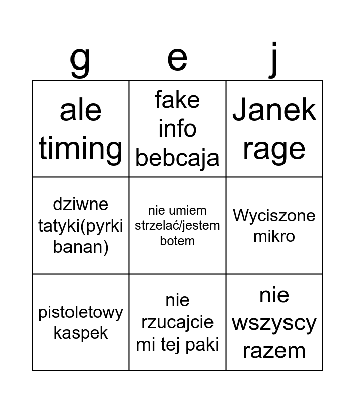 This bingo card has a free space and 8 words: Wyciszone mikro, Janek rage, fake info bebcaja, pistoletowy kaspek, ale timing, nie wszyscy razem, dziwne tatyki(pyrki banan) and nie rzucajcie mi tej paki.