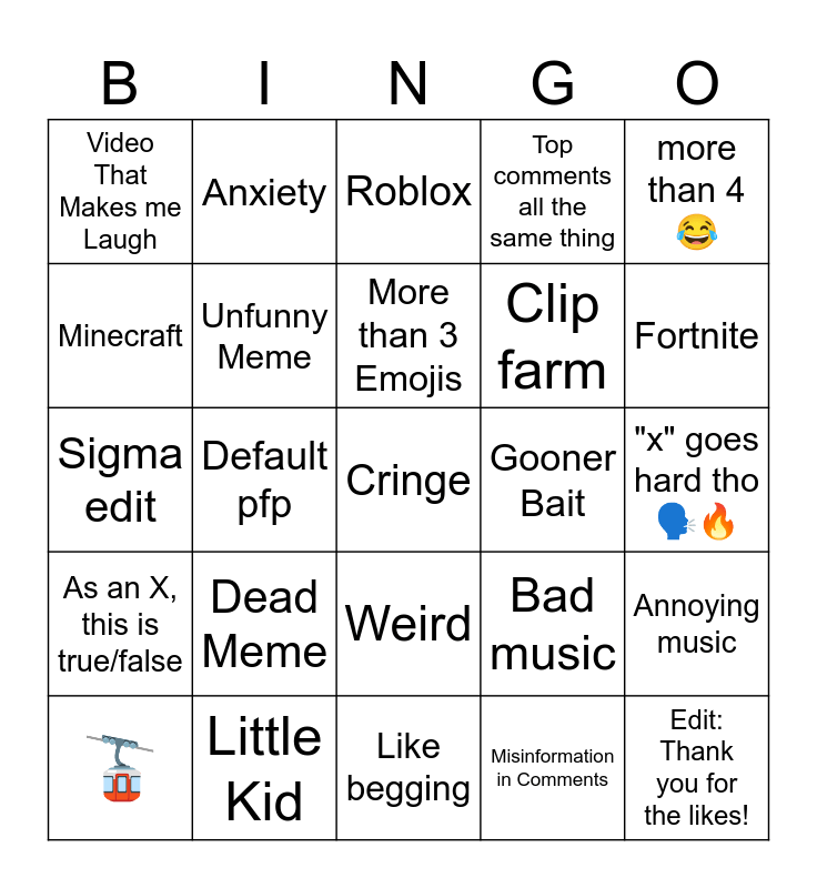 This bingo card has a free space and 24 words: Dead Meme, Little Kid, More than 3 Emojis, 🚡, more than 4😂, Video That Makes me Laugh, Minecraft, Anxiety, Gooner Bait, Weird, Clip farm, Sigma edit, Bad music, Annoying music, Unfunny Meme, Misinformation in Comments, "x" goes hard tho 🗣️🔥, Roblox, Fortnite, Default pfp, Edit: Thank you for the likes!, As an X, this is true/false, Top comments all the same thing and Like begging.