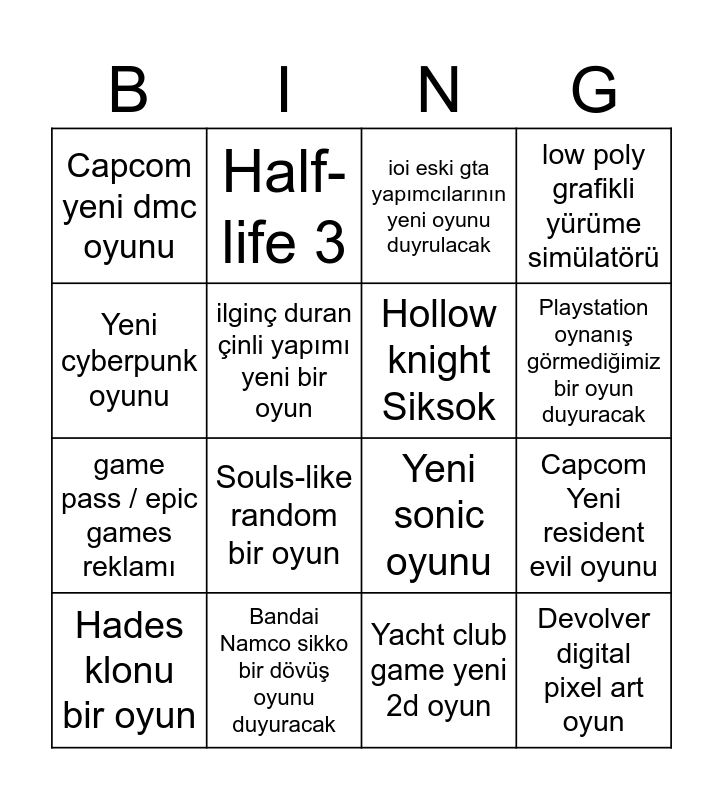 This bingo card has 16 words: Bandai Namco sikko bir dövüş oyunu duyuracak, Capcom Yeni resident evil oyunu, ioi eski gta yapımcılarının yeni oyunu duyrulacak, Capcom yeni dmc oyunu, game pass / epic games reklamı, Half-life 3, Yeni sonic oyunu, Yacht club game yeni 2d oyun, Yeni cyberpunk oyunu, ilginç duran çinli yapımı yeni bir oyun, Hades klonu bir oyun, low poly grafikli yürüme simülatörü, Souls-like random bir oyun, Playstation oynanış görmediğimiz bir oyun duyuracak, Hollow knight Siksok and Devolver digital pixel art oyun.
