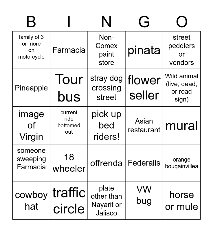 This bingo card has a free space and 24 words: 18 wheeler, traffic circle, stray dog crossing street, cowboy hat, street peddlers or vendors, family of 3 or more on motorcycle, Pineapple, Farmacia, Asian restaurant, offrenda, flower seller, image of Virgin, Federalis, orange bougainvillea, Tour bus, VW bug, mural, Non-Comex paint store, Wild animal (live, dead, or road sign), current ride bottomed out, horse or mule, someone sweeping Farmacia, pinata and plate other than Nayarit or Jalisco.