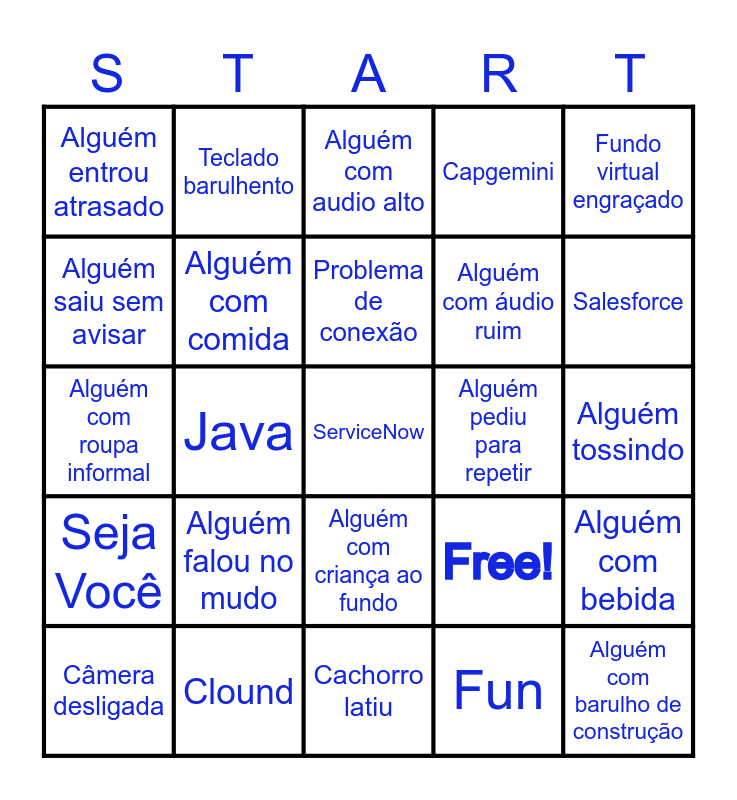 This bingo card has 25 words: Alguém falou no mudo, Cachorro latiu, Problema de conexão, Câmera desligada, Fundo virtual engraçado, Alguém entrou atrasado, Alguém saiu sem avisar, Teclado barulhento, Alguém pediu para repetir, Alguém com criança ao fundo, Alguém com áudio ruim, Alguém com roupa informal, Free!, Alguém com bebida, Alguém com comida, Alguém com barulho de construção, Alguém tossindo, Alguém com audio alto, Salesforce, Java, ServiceNow, Clound, Seja Você, Capgemini and Fun.