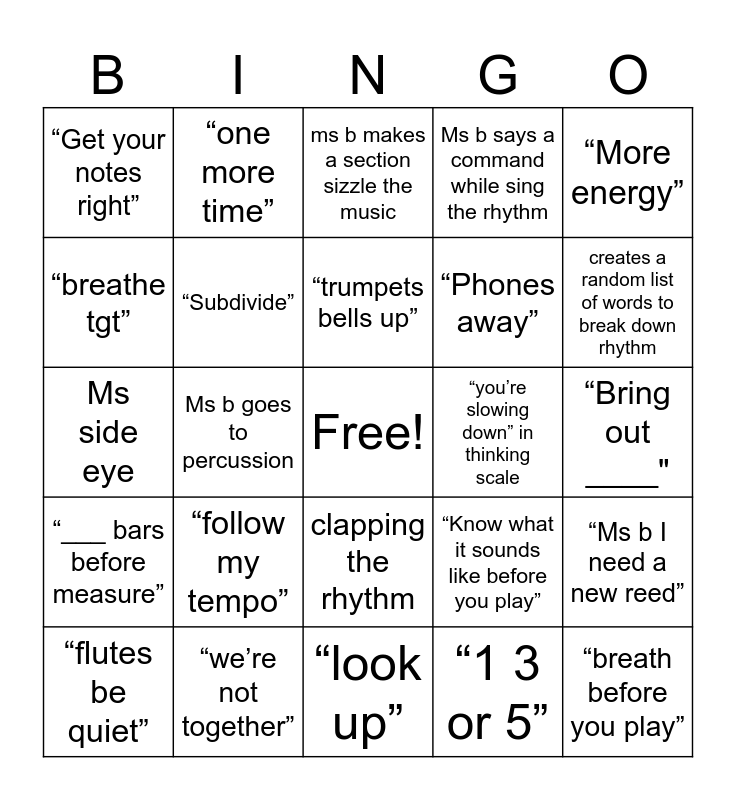 This bingo card has a free space and 25 words: “follow my tempo”, “look up”, “trumpets bells up”, “flutes be quiet”, “More energy”, “Get your notes right”, “breathe tgt”, “one more time”, “you’re slowing down” in thinking scale, clapping the rhythm, “Phones away”, Ms side eye, “Know what it sounds like before you play”, “Ms b I need a new reed”, “Subdivide”, Ms b singles out section, “Bring out ____", ms b makes a section sizzle the music, creates a random list of words to break down rhythm, Ms b goes to percussion, “breath before you play”, “we’re not together”, “___ bars before measure”, Ms b says a command while sing the rhythm and “1 3 or 5”.