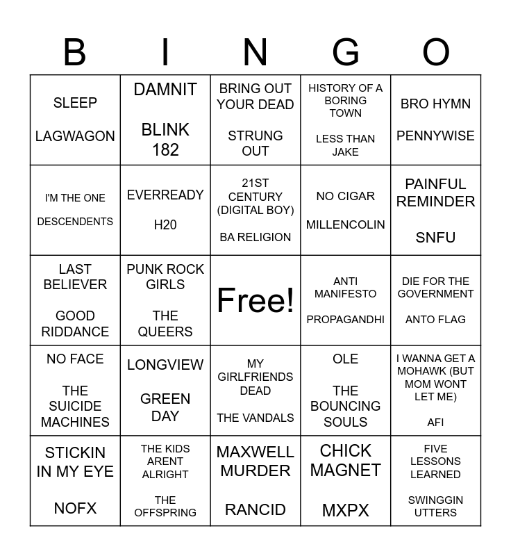 This bingo card has a free space and 24 words: LONGVIEW GREEN DAY, THE KIDS ARENT ALRIGHT THE OFFSPRING, 21ST CENTURY (DIGITAL BOY) BA RELIGION, STICKIN IN MY EYE NOFX, BRO HYMN PENNYWISE, SLEEP LAGWAGON, I'M THE ONE DESCENDENTS, DAMNIT BLINK 182, ANTI MANIFESTO PROPAGANDHI, MY GIRLFRIENDS DEAD THE VANDALS, NO CIGAR MILLENCOLIN, LAST BELIEVER GOOD RIDDANCE, OLE THE BOUNCING SOULS, I WANNA GET A MOHAWK (BUT MOM WONT LET ME) AFI, EVERREADY H20, CHICK MAGNET MXPX, DIE FOR THE GOVERNMENT ANTO FLAG, BRING OUT YOUR DEAD STRUNG OUT, PAINFUL REMINDER SNFU, PUNK ROCK GIRLS THE QUEERS, FIVE LESSONS LEARNED SWINGGIN UTTERS, NO FACE THE SUICIDE MACHINES, HISTORY OF A BORING TOWN LESS THAN JAKE and MAXWELL MURDER RANCID.
