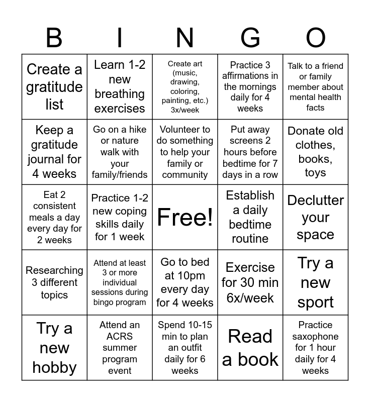 This bingo card has a free space and 24 words: Attend at least 3 or more individual sessions during bingo program, Attend an ACRS summer program event, Volunteer to do something to help your family or community, Try a new hobby, Talk to a friend or family member about mental health facts, Create a gratitude list, Keep a gratitude journal for 4 weeks, Learn 1-2 new breathing exercises, Establish a daily bedtime routine, Go to bed at 10pm every day for 4 weeks, Put away screens 2 hours before bedtime for 7 days in a row, Eat 2 consistent meals a day every day for 2 weeks, Exercise for 30 min 6x/week, Try a new sport, Go on a hike or nature walk with your family/friends, Read a book, Declutter your space, Create art (music, drawing, coloring, painting, etc.) 3x/week, Donate old clothes, books, toys, Practice 1-2 new coping skills daily for 1 week, Practice saxophone for 1 hour daily for 4 weeks, Researching 3 different topics, Practice 3 affirmations in the mornings daily for 4 weeks and Spend 10-15 min to plan an outfit daily for 6 weeks.