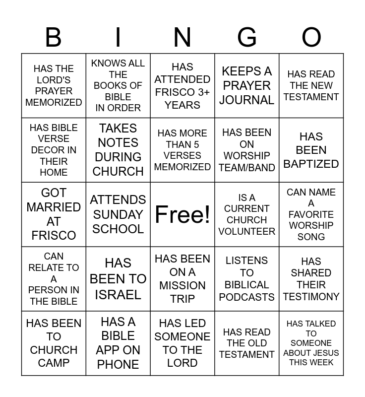 This bingo card has a free space and 24 words: HAS BEEN TO ISRAEL, HAS A BIBLE APP ON PHONE, HAS MORE THAN 5 VERSES MEMORIZED, HAS BEEN TO CHURCH CAMP, HAS READ THE NEW TESTAMENT, HAS THE LORD'S PRAYER MEMORIZED, HAS BIBLE VERSE DECOR IN THEIR HOME, KNOWS ALL THE BOOKS OF BIBLE IN ORDER, IS A CURRENT CHURCH VOLUNTEER, HAS BEEN ON A MISSION TRIP, HAS BEEN ON WORSHIP TEAM/BAND, GOT MARRIED AT FRISCO, LISTENS TO BIBLICAL PODCASTS, HAS SHARED THEIR TESTIMONY, TAKES NOTES DURING CHURCH, HAS READ THE OLD TESTAMENT, CAN NAME A FAVORITE WORSHIP SONG, HAS ATTENDED FRISCO 3+ YEARS, HAS BEEN BAPTIZED, ATTENDS SUNDAY SCHOOL, HAS TALKED TO SOMEONE ABOUT JESUS THIS WEEK, CAN RELATE TO A PERSON IN THE BIBLE, KEEPS A PRAYER JOURNAL and HAS LED SOMEONE TO THE LORD.