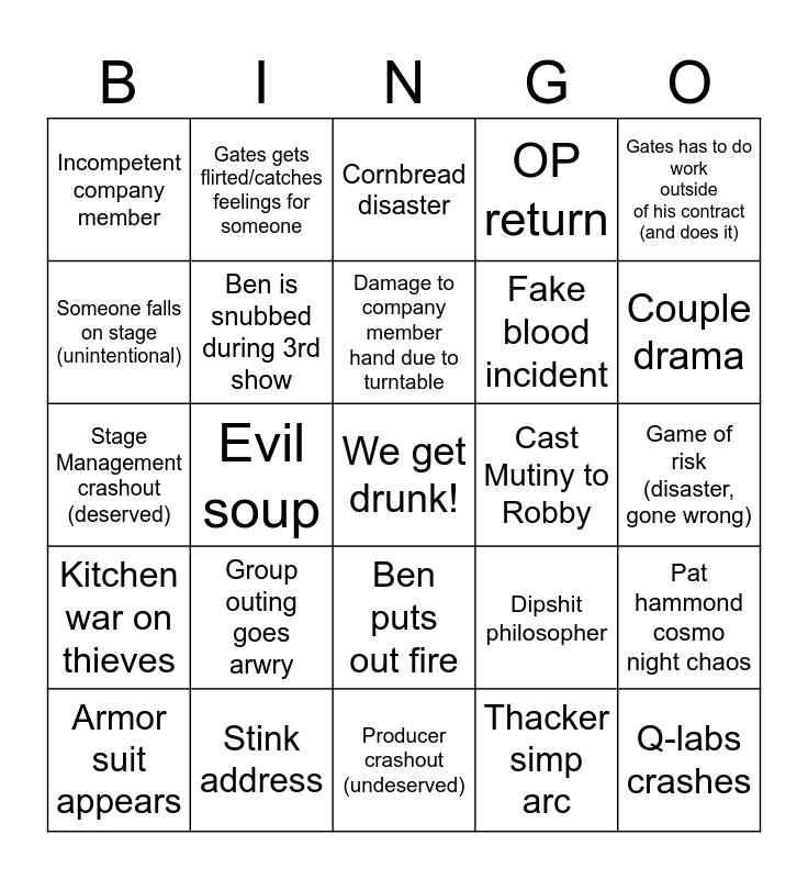 This bingo card has a free space and 24 words: Group outing goes arwry, Stink address, Damage to company member hand due to turntable, Armor suit appears, Gates has to do work outside of his contract (and does it), Incompetent company member, Someone falls on stage (unintentional), Gates gets flirted/catches feelings for someone, Cast Mutiny to Robby, Ben puts out fire, Fake blood incident, Stage Management crashout (deserved), Dipshit philosopher, Pat hammond cosmo night chaos, Ben is snubbed during 3rd show, Thacker simp arc, Game of risk (disaster, gone wrong), Cornbread disaster, Couple drama, Evil soup, Q-labs crashes, Kitchen war on thieves, OP return and Producer crashout (undeserved).