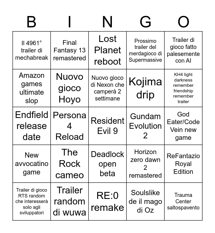 This bingo card has a free space and 24 words: The Rock cameo, Trailer random di wuwa, Nuovo gioco di Nexon che camperà 2 settimane, Trailer di gioco RTS random che interesserà solo agli sviluppatori, Trailer di gioco fatto palesemente con AI, Il 4961° trailer di mechabreak, Amazon games ultimate slop, Final Fantasy 13 remastered, Gundam Evolution 2, Deadlock open beta, Kojima drip, Endfield release date, Horizon zero dawn 2 remastered, ReFantazio Royal Edition, Nuovo gioco Hoyo, Soulslike de il mago di Oz, God Eater/Code Vein new game, Lost Planet reboot, KH4 light darkness remember friendship remember trailer, Persona 4 Reload, Trauma Center saltospavento, New avvocatino game, Prossimo trailer del merdagioco di Supermassive and RE:0 remake.